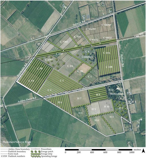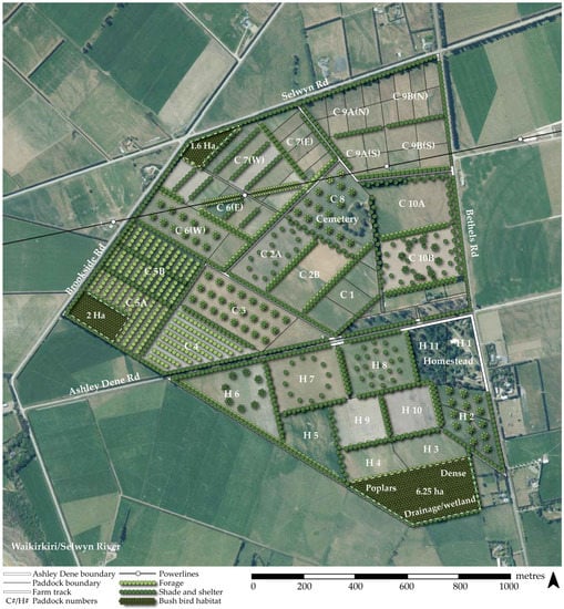 While this study considers native woody vegetation, it also recognizes the importance of exotic vegetation within agricultural landscapes. As many exotic species used in Aotearoa New Zealand agricultural landscapes are deciduous (as opposed to most native woody vegetation being evergreen), leaf fall in winter increases soil organic matter and allows additional light to reach the ground, reducing the frequency and duration of frosts []. Furthermore, exotic vegetation tends to grow taller more rapidly when compared to native vegetation, enabling faster establishment of shade and shelter, one of the aims of this study (M. Bloomberg, personal communication, 25 July 2022) [].
