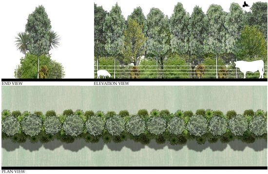 The second component considered in this research focused on providing shade and shelter within dryland agricultural landscapes. The New Zealand Animal Welfare Act 1999 [] states that livestock should be protected from extreme weather events such as heat, cold winds, and heavy precipitation. Shade and shelter in agricultural landscapes provide this protection by mitigating climatic extremes [], allowing regulation of body heat and stress associated with extreme heat and cold []. According to Farm Forestry New Zealand (2011) [], the optimum porosity of shelter plantings should be between 40–60%, which can be determined by species composition and overall width [,], with shelter extending downwind approximately 2.5 times the height of the trees []. Furthermore, to reduce the amount of wind moving around the ends of the shelter vegetation, the overall length should be at least ten times the height [].