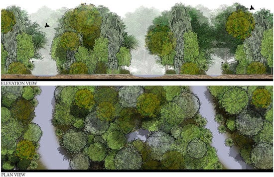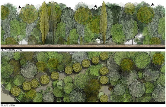 Three site designs were created using the case study method [], placing each planting configuration in the most suitable location based on environment and soil characteristics and site inventory from Figure 3. Each design maximized the benefits of a specific multifunctional landscape component, with minimal consideration for other functions.