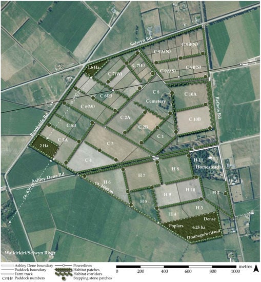 The wider landscape surrounding the case study site is the eastern Selwyn District (an area bounded by Christchurch City to the northeast, State Highway 1 to the northwest, the Rakaia River to the southwest and the Pacific Ocean to the southeast). Native bush birds previously seen in this area are fantail/pīwakawaka (Rhipidura fuliginosa), bellbird/korimako (Anthornis melanura), South Island robin/kakaruai (Petroica australis), tomtit/miromiro (Petroica macrocephala), silvereye/tauhou (Zosterops lateralis), New Zealand pigeon/kererū (Hemiphaga novaeseelandiae), welcome swallow/warou (Hirundo neoxena), grey warbler/riroriro (Gerygone igata), rifleman/tītitipounamu (Acanthisitta chloris), sacred kingfisher/kōtare (Todiramphus sanctus), brown creeper/pīpipi (Mohoua novaeseelandiae), pipit/pīhoihoi (Anthus novaeseelandiae), morepork/ruru (Ninox novaeseelandiae), tūī/parson bird (Prosthemadera novaeseelandiae), long-tailed cuckoo/koekoeā (Urodynamis taitensis), and shining cuckoo/pīpīwharauroa (Chrysococcyx lucidus) [].