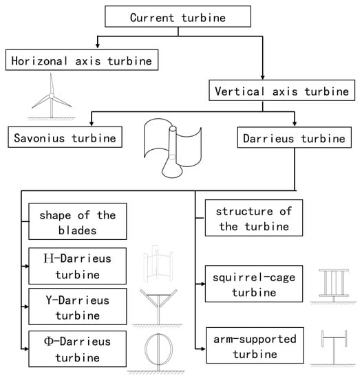 According to the installation mode of the turbine [21], the turbines can be divided into vertical axis type and horizontal axis type as in Figure 1. Most vertical-axis turbines have the design consideration that the horizontal flow in any direction can be utilized [22,23], while the horizontal axis can utilize the flow energy in only one horizontal direction by tracking and changing the direction [24]. The Darrieus turbine can also be installed with a horizontal axis [25,26] to utilize shallow water, and the turbines cannot be fully immersed to generate power but can still utilize water in two directions [27], which needs multiphase modeling [28].
