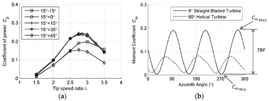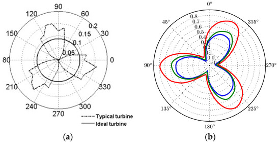 The instantaneous power coefficient/torque of the Darrieus changes periodically with the blade angular position, and the rotational speed of the actual turbine fluctuates with the changing power. The blade can provide a large torque before stalling at a small range of attack angle. After stalling, the blade torque drops rapidly. The minimum turbine torque has a great influence on start-up [38]. The lower ratio of maximum to minimum torque means more stability of the turbine, and the ideal torque and power were expected to be smooth during operation. The instantaneous power coefficient and torque were usually used to evaluate the turbine, as shown in Figure 3 [39,40]. Curves of a single blade were used to optimize some characteristics, and curves of turbines can show the fluctuations of an actual turbine. The cycles of torque and power can be better shown in curves with polar coordinates. The curves can be compared to improve optimization by relating power and torque with the optimization parameter.