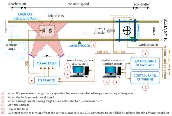 Gorle et al. [69] dragged the turbine with the drag system to measure the power and flow field at different angles, with the experimental setup shown in Figure 4. The experiment provided the relative velocity by the drag system, and the image acquisition section had a fixed distance from the starting section. The phase of the turbine was controlled by the initial phase at the starting section and the rotational speed.