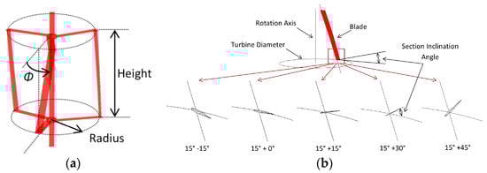 The torsion angle, as shown in Figure 7, was defined as the angle that a torsional blade covers. The blade was made along a helical line. Tilt straight blades were used to cover a range, but the attack angle was fixed and not good as the torsional blades [94,95,96]. Torsion for egg-shaped turbines was also developed as Troposkein turbines [97], the straight-blade turbine showed better in power output, but the Troposkein could take greater loads.