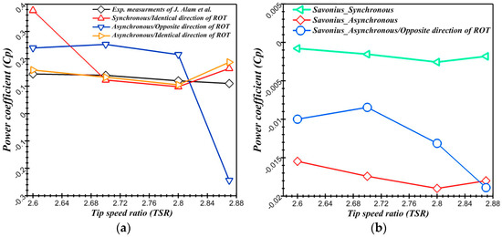 Ed-Dn Fertahi et al. [113] focused on the performance of the combined turbine. A four-blade Darrieus turbine was coupled with a double-stage Savonius turbine. Synchronously and asynchronously coupling were compared, and the rotational directions were considered. As shown in Figure 11, asynchronous coupling (same rotational direction) provided the best performance. In asynchronous coupling, the Savonius turbine in the low-speed range can provide a significant starting torque. After the startup, the performances of the Savonius and Darrieus turbines in asynchronous coupling were closer to the optimum speed compared to synchronous coupling. The numerical results showed that the optimized range of TSR has to be considered in coupling.