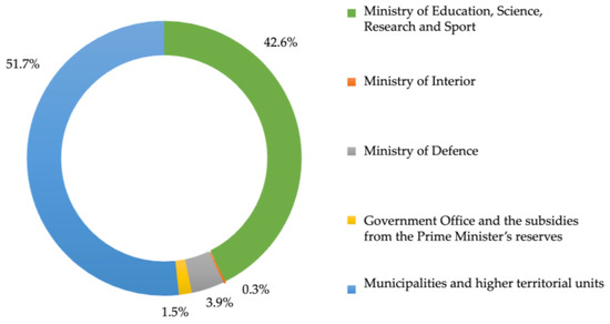 Funding sports as a separate category falls mainly under the responsibility of the Ministry of Education, Science, Research and Sports of the Slovak Republic (MESRS). However, this does not mean that at the national level, other ministries do not also participate in it, to a certain extent. For example, the Ministry of the Interior (MI) funds police sports clubs, the Ministry of Defense (MD) allocates funds to a military sports center, and the Government Office (GO) itself should not be omitted with the allocation of subsidies (subsidy allocation—SA) from the prime minister’s reserve, funding various sports projects [28].