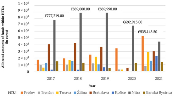 Within the national level, the research activity drew data mainly from the individual budget chapters of the ministries and other governing organizations, purposefully linked to the funding of sports at the studied level in Slovakia. Namely, it was the Ministry of Education, Science, Research and Sports [43]; the Ministry of the Interior [44]; the Ministry of Defense [45]; the Government Office and the institution for allocating subsidies from the prime minister’s reserve [46]; and, finally, the municipalities with the HTUs [47].