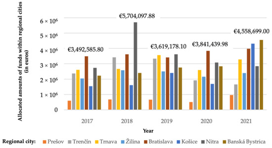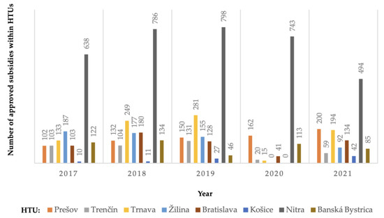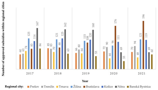 A more demanding, deeper comparison was made in the case of analyzing regional or local levels, where data were available in various forms, which greatly complicated the entire process of their analysis. For the research activity, this meant that each subsidy had to be identified in detail, separately. In total, more than 10,000 subsidies were evaluated within this comparison—subsidies that related to the monitored period between 2017 and 2021.