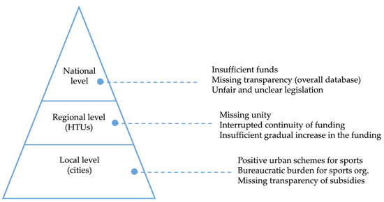 Regarding the national level of sports and sports management, researchers and academicians often focus their attention on the national sports teams competing in mega sports events such as the Olympic Games. This is the type of research dealing with the national support of specific sport types, preferred by individual countries and their governments. Another perspective, still at the national level of sports funding, is then brought by treating sports in the country as a specific industry itself. Refs. [23,24,25] The approaches of individual countries differ, but their main goal stays the same. They all strive to create appropriate conditions for sports and the sustainable operation of sports organizations. This supports the research aimed at studying the specifics of the national systems and policies of various countries, so that the shortcomings and inefficiencies can be identified and proper recommendations for future changes can be designed.