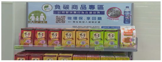 The research was conducted in collaboration with six FamilyMart convenience stores located in Sanxia District, New Taipei City. The carbon-negative products zone in the FamilyMart convenience stores is shown see in Figure 3. This study developed carbon-neutral product labeling to convey the message of carbon-negative consumption behavior; advocated lifetime personal carbon-neutral consumption for establishing new low-carbon living paradigm, i.e., promoted personal social responsibility (PSR), to form new social norms; as well as established a personal carbon asset account to create a friendly and low transaction cost environment to nudge consumer low-carbon behavior change.