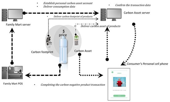 Internet of Things (IoTs) technology is applied to uniquely identify and trace the carbon credits acquired through an individual’s product transactions (or PCT), and also provide carbon credit account management services (personal carbon asset account, PCAA) for trading, transferring, and storing individual carbon credits. The operation procedure is described as follows (see Figure 5): (1) Step 1: establishing a personal carbon asset account. (2) Step 2: completing a carbon-negative product transaction. (3) Step 3: consumers scan the QR-code on the tag of carbon-negative products; then, the data will be sent to the Low Carbon Life Net server. (4) Step 4: The FamilyMart server will send the transaction data of the consumption to the server of Low Carbon Life Net at the same time and check the data to confirm that it is correct, then the carbon credit delivery will be completed. The next day, the system will notify consumers by email that the carbon credits have been entered into the PCAA.
