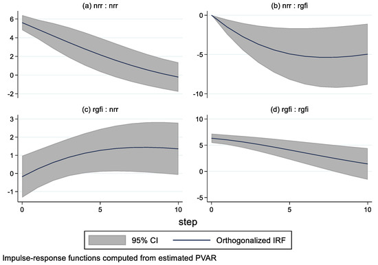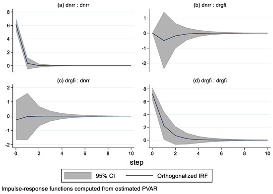 Before we estimated panel VAR, we tested for the unit root to check each variable in the time-series VAR for stationarity. The unit root test is relevant in linear dynamic panel model estimation using the generalized method of moments (GMM)—a generic method for estimating parameters in statistical models. If the variable is close to the unit root, the GMM estimators experience a weak instrument problem, and GMM inferences are misleading [39]. The Im–Pesaran–Shin unit-root test was applied to the variables, and the null hypothesis that there were unit roots was not rejected. After taking the first difference, the first difference of nrr and rgfi, namely dnrr and drgfi, became stationary with and without a trend. We also identified the appropriate lag order using the lag selection criterion (Appendix A, Table A1). The appropriate lag order within a panel VAR was the one with the smallest statistic values for the MBIC, MAIC, and MQIC [40,41]. In our estimations, the MBIC, MAIC, and MQIC were smaller at lag order 1. As a robustness check, we checked the eigenvalue stability condition. All the eigenvalues were inside the unit circle, confirming that the estimated panel VAR was stable (Appendix A, Figure A1).