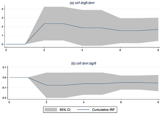 where yit is the real gross capital formation, μi is a country-specific intercept term demonstrating the fixed effect, A is a parameter matrix, and εit is the residual term. Country and year are indicated by the subscripts i and t, respectively. The information criteria criterion (aic) is used to choose the VAR, which only contains first-order lags. A fixed-effects estimator may not be consistent in estimating dynamic models; therefore, to drop the fixed effect, we first used differencing and applied lagged values [38] and obtained the first difference in total natural resource rent (share of GDP) (dnrr) and the first difference in real gross fixed investments (drgfi), respectively. We imposed a recursive structure to find the shocks, which made the variables’ order relevant. Although a delay was present, we anticipate changes in investment in the development of non-resource sectors to contribute to economic diversification. For this reason, we prioritized gross fixed investment over non-resource rent. However, we considered the VAR in the reverse recursive order as a robustness check. It turns out that, in this instance, the imposed order had little to no impact on the estimated long-run impulse responses.