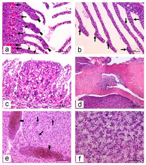 Some of the histopathological alterations found in gill (a–c) and liver (d–f) samples in the present study: (a) proliferation of the epithelium around one or two secondary lamellae (double arrowheads) and infiltration of eosinophilic granulocytes in the primary epithelium (arrows). Note mucous cells in primary and secondary lamellae emptying their contents in the environment (arrowheads) (HE × 400); (b) hypertrophy of respiratory epithelium (arrows), especially pronounced on the tips of secondary lamellae (HE × 400); (c) hyperplasia of the epithelium between the secondary lamellae and subsequent necrosis of the tissue with infiltration of leucocytes (HE × 400); (d) vascular fibrosis (HE × 200); (e) blood stasis in the vessels (double arrowheads) and congestion of sinusoid capillaries (arrows) (HE × 200); (f) vacuolization of hepatocytes in the liver parenchyma (HE × 400).