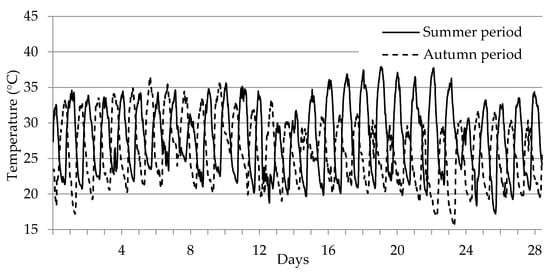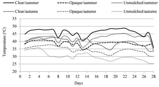 Air temperature during a four-week period, i.e., 24 July to 20 August 2014 for the summer solarization period and 20 August to 19 September 2014 for the autumn solarization period.