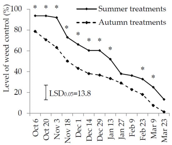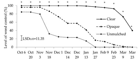 Level of weed control of plots treated during summer, as affected by the type of soil mulching, during the winter weed flush period (October 2014 to March 2015). Values are the mean of six replicates. Asterisks (*) indicate significant differences between treatment means on a single sampling date according to Fisher’s least significant difference (LSD) at p < 0.05 following the repeated measures model.