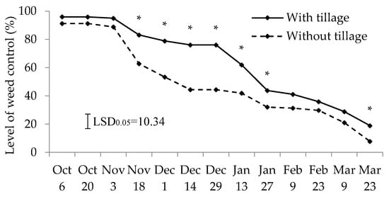 Level of weed control of plots treated during summer, as affected by the type of soil preparation, during the winter weed flush period (October 2014 to March 2015). Values are the mean of nine replicates. Asterisks (*) indicate significant differences between treatment means on a single sampling date according to Fisher’s least significant difference (LSD) at p < 0.05 following the repeated measures model.