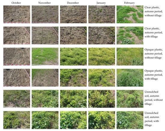 Images of plots that have undergone solar solarization during autumn, as affected by the type of soil mulching and soil preparation, during the winter weed flush period.