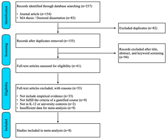 The scope of this meta-analysis is defined by studies that have investigated the influence of gamification on English proficiency, identified through a search on the Research Information Sharing Service (RISS). RISS, a well-acknowledged Korean academic database, provides a broad platform to perform meta-searches across prime academic databases in Korea, such as KCI, DBpia, e-article, KISS, Kyobo Scholar, etc. Furthermore, RISS accommodates almost all of Master’s theses and Doctoral dissertations from universities in South Korea. The search, conducted in April 2023, utilized keywords such as ‘gamification’ and ‘gamified learning’, along with their Korean equivalents.