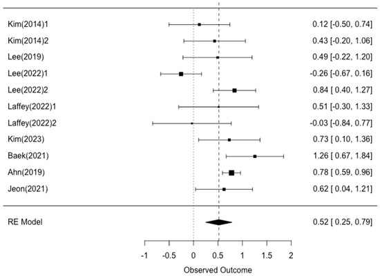 Subsequently, we employed Hedges’ g to determine the individual effect size for each study. As shown in Figure 2, the resulting individual effect sizes displayed a range from −0.26 to 1.26. Among these, we observed nine instances of positive effect sizes and two of negative, indicating that most studies reported beneficial outcomes.