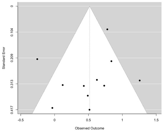 Before the computation of effect sizes, we conducted a homogeneity test (Q-test). The outcome revealed a significant level of heterogeneity amongst the analyzed studies (Q = 30.848, df = 10, p = 0.001). Notably, about two-thirds of the observed variability in the results across studies (indicated by the I2 statistic of 67.583) was due to true differences in effect sizes rather than merely sampling errors. Considering the typical interpretation of I2 values—25%, 50%, and 75%, corresponding to low, moderate, and high heterogeneity, respectively [53], our study unveiled a moderate to high level of heterogeneity.