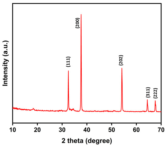 The XRD pattern for the CaO nanocatalyst was recorded between 210° and 70° as shown in Figure 1. The XRD peaks were detected at 2θ = 32°, 34°, 37°, 54°, and 64°, and they met the criteria set in the international center for diffraction data file for nanocatalyst CaO (JCPDS 37-1497) [41]. The data collected from the XRD analysis showed high clarity and crystallinity of the sample. The Debye–Scherrer equation (Equation (2)) was used for calculation of crystallite size of the nanocatalyst and it was found to be 36.8 nm.