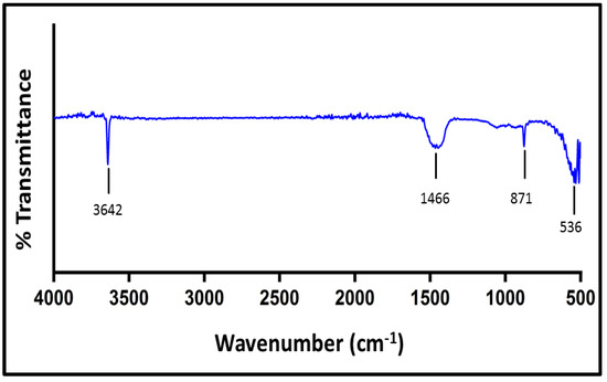 FT-IR analysis was carried out to find out the functional groups present in the catalyst and the results are presented in Figure 2. The band at 536 cm−1 was due to vibration of Ca-O bonds [42,43]. The band obtained at 3642 cm−1 indicated the presence of O-H bonds. The weak bands around 871 and 1466 cm−1 were due to asymmetric C=O stretching of the carbonyl groups present in the catalyst species [43,44]. Thus, conversion of Ca(OH)2 to CaO was pointed out by the FT-IR results, though a small amount of Ca(OH)2 and CaCO3 (calcium carbonate) was still there due to moisture and CO2 absorption. Similar findings were reported by Habte et al. [42] and Roy et al. [43].
