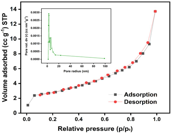 BET analysis was performed to study the total surface area, pore size distribution, and total pore volume of the CaO catalyst. Figure 4 depicts the N2 adsorption–desorption isotherm of the catalyst, which resembles a type IV hysteresis loop that specifically corresponds to mesoporous materials [45]. The estimated surface area, pore volume, and pore size of the catalyst were 10.9 m2 g−1, 0.022 cc g−1, and 2.66 nm, respectively. Figure 4 shows that the evaluated size of the pores using the BET method match the range assigned for mesoporous materials. The available surface area, size, and structure of the pores are highly influential in determining the rate of catalytic activity of a nanocatalyst. Pores are highly essential for easy and unhindered transfer of reactant and product molecules. Mesoporous materials speed up the reaction by facilitating the diffusion of reactants and products into the pores. Microporous materials on the other hand, let the reaction occur only at the entry of pores and lead to a noticeably lower rate of reaction than the mesoporous materials [46]. Thus, our mesoporous nanocatalyst CaO can boost the rate of the reaction significantly during biodiesel production.
