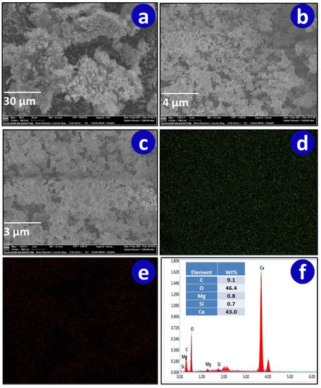 SEM analysis was performed to study the morphology of the catalyst. The SEM images in dimensions of 10, 4, and 3 µm are depicted in Figure 5. According to the SEM images, the structure is determined to be very porous, containing a significant number of active sites. The shape and size of the particles are also uniform. Also, several aggregates with mesoporous and sheet-like structure were observed. Calcination may cause sintering and partial agglomeration of mineral particles resulting in the formation of aggregated particles with asymmetrical shapes and diverse sizes [40,47]. The elemental weight % as shown in Figure 5f, the SEM-EDX mapping, include Ca (43 wt%), O (46.4 wt%), C (9.1 wt%), and Si (0.7 wt%).