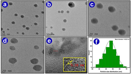 TEM was performed to study the quantitative measures of particles, the size distribution, and, basically, for morphology, as shown in Figure 7. TEM images defined the catalyst to be granular and powdered with a spherical shape. The granules were formed from a large number of smaller granules with an average diameter of 46.2 nm. The pictures show that there existed no agglomeration of the granules. Because of the porous nature of the CaO nanocatalyst, there was easy contact between the catalyst surface and the substrate, which was the reason for enhancement in the catalytic activity [53]. HRTEM images in Figure 7e reveal that the lattice fringes with an interplanar distance of 0.27 nm are consistent with the (202) plane of CaO.