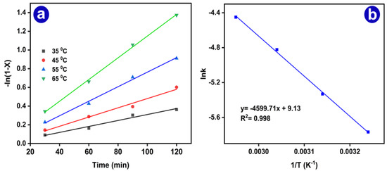 In order to study the kinetics of the reaction, the transesterification reaction was performed at various requisite temperature intervals (35, 45, 55, and 65 °C). Methanol was used in an excess amount; hence, the reaction is expected to follow pseudo first-order kinetics. The data obtained from the experiments accurately fit to a straight line so it seems to follow a pseudo first-order reaction (Figure 8a). As per various literature data and reports, researchers claim that the transesterification reaction of soybean oil with methanol to produce biodiesel follows pseudo first-order kinetics [66]. The equation for first-order reaction kinetics is given below in Equation (4) in which k is the rate constant and can be derived from the slope of the graph of −ln(1 − Xt) vs. time.