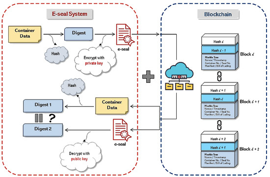 Figure 1 shows that a digital digest from original container data using a hash function is generated and encrypted with the member’s private key to create an electronically sealed document. The encrypted data is then packed into block data (note that a hash tree may also be called Merkle tree). The data can be obtained from the corresponding block in the blockchain, and the authenticity can be verified by decrypting with the pairing public key. In addition, it shows that the original data is hashed to obtain another digest and compared with the two digest sources to determine whether consistency could be reached. When conformity is achieved, the data are stated as not being interfered with.