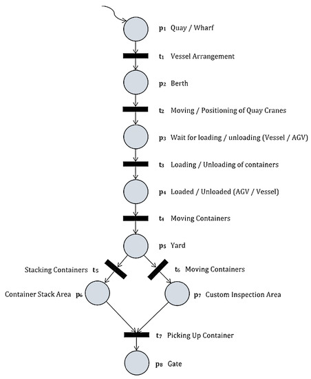 A container operation procedure can be modelled as a Petri net with a 4-tuple , where is the set of m places and is the set of n transactions on the seaport and container terminal. Each transaction is a bridge linking two places . It is formulated from input I and output O functions, where , , and . Figure 2 introduces a Petri net model with eight places () and seven transactions (), i.e., and .