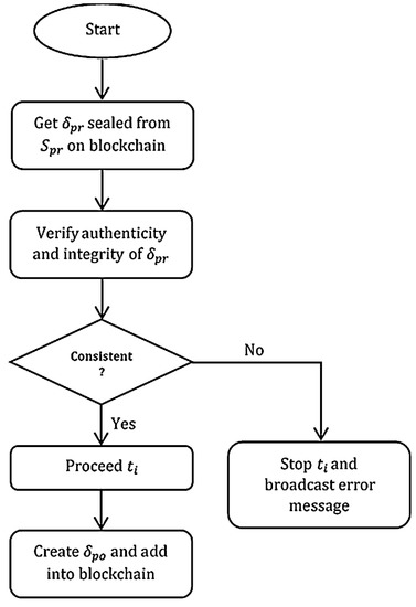 Let be the current transaction, the previous stakeholder (referenced for current transaction ), the following stakeholder (responsible for the current transaction ), the sealed data from , and the sealed data from . In this way, the integrity of the e-seals must be checked for all previous party(s) before proceeding to the next transaction for each following stakeholder . The following transactions are organised after ensuring that the e-seals are functioning properly. Consequently, the necessary condition for implementing the next transaction is , where is the previous transaction and is the following one.