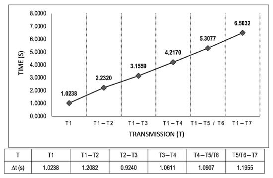 It should be noted that the transmission time increases by about one second once the data is passed to the next stakeholder. Therefore, the time needed for each transaction is approximately one second. Consequently, the total transmission time throughout the container handling procedure at the terminal with blockchain technology in data transactions is s for each container. With the NIST-256p or NIST-384p curves, the required transmission time is shortened, approximately s and s. The transmission time between all the transactions is shown in Figure 4.