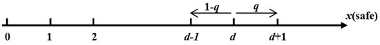 The Gambler’s ruin theory states that if a gambler divides his money into n parts for gambling in a casino, his chances of winning or losing the gambling are one-half. If this gambling game is infinite, the gambler will finally lose all his money. This scenario is very similar to a blockchain attack. If the chain has already been mined by honest miners with n blocks and the chain from an attacker has m blocks, then is the times of the gambling game between attackers and honest miners. Once the honest miners have lost all the chances within d times because the attacker’s mine has the same or more blocks than the honest miners, the computing power will automatically be transferred to the new fake chain, and the attacker wins the game. Figure 5 shows an example of a gambling game.