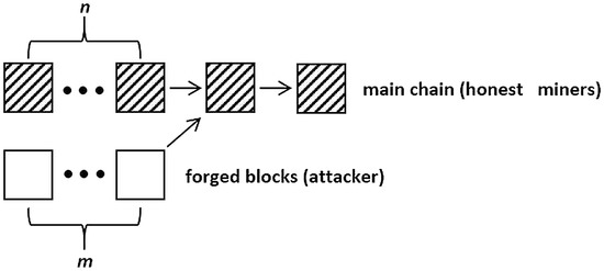 - Case 1: . The attacker has mined more blocks than honest miners, so the forged chain is recognised to be valid and becomes the new main chain. Set as the expected value that the attacker mined a new block with computing power within the period while honest miners mine n blocks on the main chain. It can be calculated as shown in Equation (6).