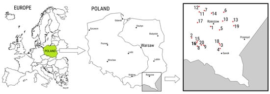 Map of Poland and the Subcarpatia region with marked manors where floor inventories were made: (1) Boguchwała, (2) Bieździedza, (3) Dydnia, (4) Falejówka, (5) Hyżne, (6) Julin, (7) Kolbuszowa, (8) Kopytowa, (9) Krosno, (10) Łańcut, (11) Niwiska, (12) Ostrowy Tuszowskie, (13) Przeworsk, (14) Przewrotne, (15) Szebinie, (16) Tarnowiec, (17) Witkowice, (18) Wydrna, (19) Zarzecze, (20) Żarnowiec.