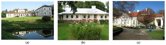 Views of typical Polish bricked (a,c) and wooden (b) manor houses from the Subcarpatia region: (a) Komborna Manor, (b) Kopytowa Manor, (c) Witkowice Manor.