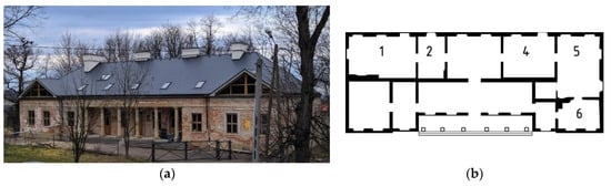The Tarnowiec Manor House (Figure 3a) is dated back to the 1830s, on the basis of historical records and its stylistic features [31,32,33]. The manor was built in the Empire style. It is a building comprising two enfilades, with 11 axes in the front facade (with two axes at each side risalit) and 10 axes on the side of the garden enfilade, with an engaged portico on the axis of the front facade (Figure 3b).
