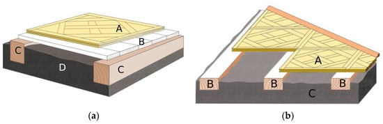 Diagram of floor construction in the Tarnowiec Manor House in rooms 1, 2, 6 ((a) A—panel, B—boarding-decking, C—beams, D—sand with clay) and in rooms 4, 5 ((b) A—panel, B—beams, C—sand with clay).