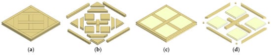 Diagram of structure and wood type in parquet panels of the Tarnowiec Manor House: (a,b)—Rooms No. 1,2,6 and 4; (c,d)—Room No. 5 {