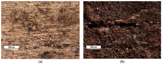 Abrasion resistance tests carried out by measuring the mass loss of the sample after 100 revolutions (Table 1) revealed that the resistance parameters of oak and elm from the Tarnowiec Manor House are comparable with the results of certain contemporary samples (taking into account the standard deviation). The average mass loss of oak from Room 4 was lower than the mass loss of contemporary oak, in the case of each sampling point location. The differences amount to 30% for samples collected in the external corner of the room (sampling point 1), 51% for samples collected from traffic paths (sampling point 2), and 24% for samples collected from the internal corner of the room (sampling point 3). The same relation was observed for elm samples from Room no. 5 (57% for the external corner of the room—sampling point 1; 41% for traffic paths—sampling point 2 and 30% for internal corner of the room—sampling point 3). The largest mass loss was observed for oak samples from Room no. 1 (currently 109) in Tarnowiec (about 1 g). The most variable mass loss results were obtained for antique wood, especially oak from Room 1.