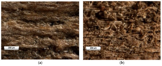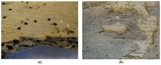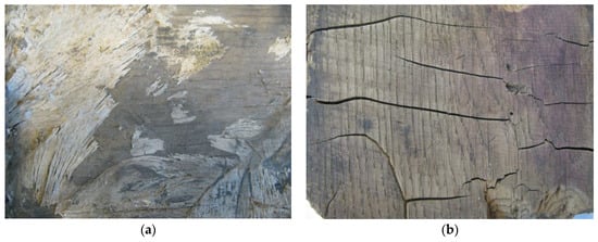 The wood of those elements turned grey and had a less cohesive structure, and was attacked by insects and fungi (Figure 8 and Figure 9). The fungi destroyed only the bottom surface of elements (Figure 9a) or their entire structure: dark brown color (brown-rot decay), mass loss, and spongy structure cracking after drying (Figure 9b).