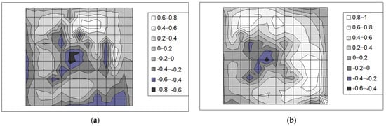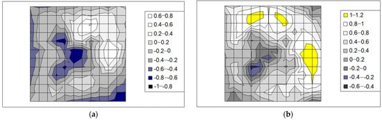 Measurements of transverse curvature (height map of the surface) of contemporary copies of parquet panels from Room 4 in the Tarnowiec Manor House after swelling: panel A (a) and panel B (b); deformation values given in mm.