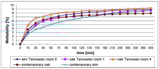 Antique wood has the disadvantage of a shorter moisture exchange time. It absorbs water faster than contemporary wood, which translates into unfavorable dynamic changes in wood dimensions and higher equilibrium moisture of wood (Figure 14).