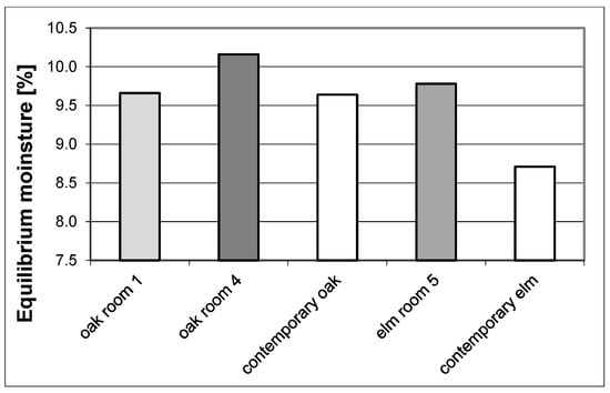 Equilibrium moisture of antique oak wood from Room no. 1 and Room no. 4, as well as elm from Room no. 5 of the Tarnowiec Manor House compared to contemporary oak and elm.