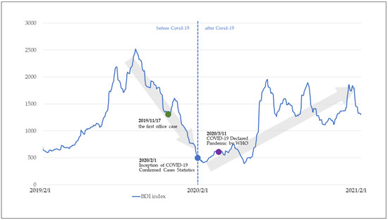 COVID-19 exploded in 2020, severely disrupting international trade and causing inefficiencies, delays, and supply chain disruptions on an unprecedented scale [3,4]. Typically, such disruptive circumstances would lead to a downturn in freight activities. However, contrary to expectations, the freight index experienced a substantial increase over time as the epidemic continued to unfold. It is intriguing to investigate the reasons behind the initial decline of the freight index at the onset of the COVID-19 pandemic, followed by a sudden and explosive rise, as illustrated in Figure 1. This notable change has sparked curiosity and garnered the attention of our research inquiry. Hence, this research aims to investigate the key determinants influencing the BDI both prior to and following the outbreak of the COVID-19 epidemic. The findings reveal a shift in the factors impacting the BDI during the COVID-19 pandemic. Specifically, the US Dollar Index, Brent, Port Calls, and CRB Index exhibited greater influence before the epidemic. Conversely, variables such as the US Dollar Index, Port Calls, and Iron Price emerged as more significant factors after the epidemic.
