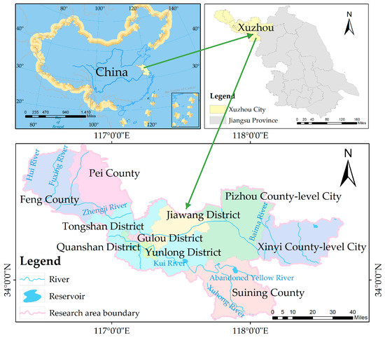 The study area (Figure 1, 116.358°~118.667° E and 33.717°~34.976° N) is located in the northwestern region of Jiangsu Province, China, a border zone between the provinces of Jiangsu, Henan, Shandong, and Anhui, with a total area of 11,765 km2 including five districts (i.e., Gulou, Quanshan, Yunlong, Tongshan, Jiawang), three counties (i.e., Suining, Fengxian, Peixian) and two county-level cities (i.e., Pizhou and Xinyi). Agricultural land accounts for 74.5% of the total land area of Xuzhou. The surface water system is bounded by the abandoned Yellow River, which is divided into two water systems (i.e., Yi, Shu and Si water systems in the north, and the Huaihe River system in the south). There are several artificial lakes in Xuzhou, such as Yunlong Lake, Dalong Lake and Jinlong Lake. In the last five years, due to the remarkable achievements of groundwater management in Xuzhou City, the average depth of deep groundwater has increased from 17.09 m to 13.82 m. At the end of 2020, the city had a total population of around 9.08 million with regional GDP of 731.977 billion yuan (https://www.yearbookchina.com accessed on 6 November 2022). Precipitation is mainly concentrated between June and September, with an average annual precipitation of 825 mm, which is lower than the average annual evaporation of 874 mm. Consequently, seasonal water resource shortages are common. Despite its location in a temperate climate zone, water resources are extremely scarce and have uneven spatiotemporal distribution, making it one of the 40 cities in China severely afflicted by water shortages [55]. As the primary center city in the Huaihai Economic Zone, ensuring the sustainable and coordinated development of water resources, socioeconomics, and ecology is a top concern for the region.