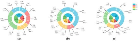 To estimate the combined weights, the relative weights of the four subsystems and fourteen indexes were calculated by the entropy weight method and the hierarchical analysis approach, as shown in Figure 4.